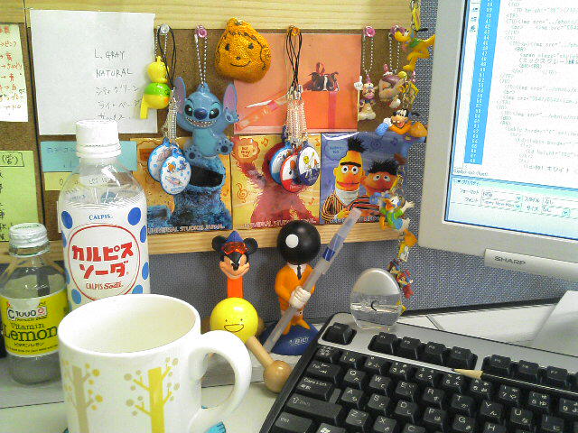 23 March デキる人 デキる女の仕事場初公開(笑)なんてな。ちょっと職場の机を撮影してみた。いやぁ。おもちゃだらけ。必要なメモは、この隣のコルクボードに貼ってあるのですな。不要なモノをぽいぽい捨てていった結果、半分空いてしまったので、おもちゃを飾ってしまうま。さ。働くか。 PR