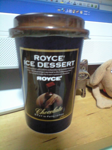14 February 自分チョコ 板チョコの食べすぎで、「うえっぷ」となったにもかかわらず、本日も自分チョコ。ロイズのアイスでございます。んまかった~!!!!んでも、最後のほうはやっぱりキツくって、ちょっと「うえっぷ」となっておりました。この写真、へんな感じに光があたってて、カップが浮いているように見える。私の目にはそう映る。変な感じ~。そしてピンボケ。通りすがりの際にはパチっとweb拍手をお願いします。