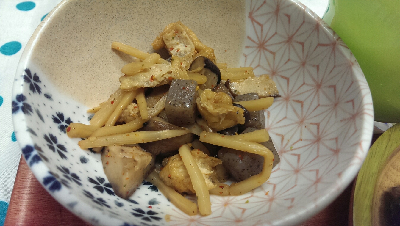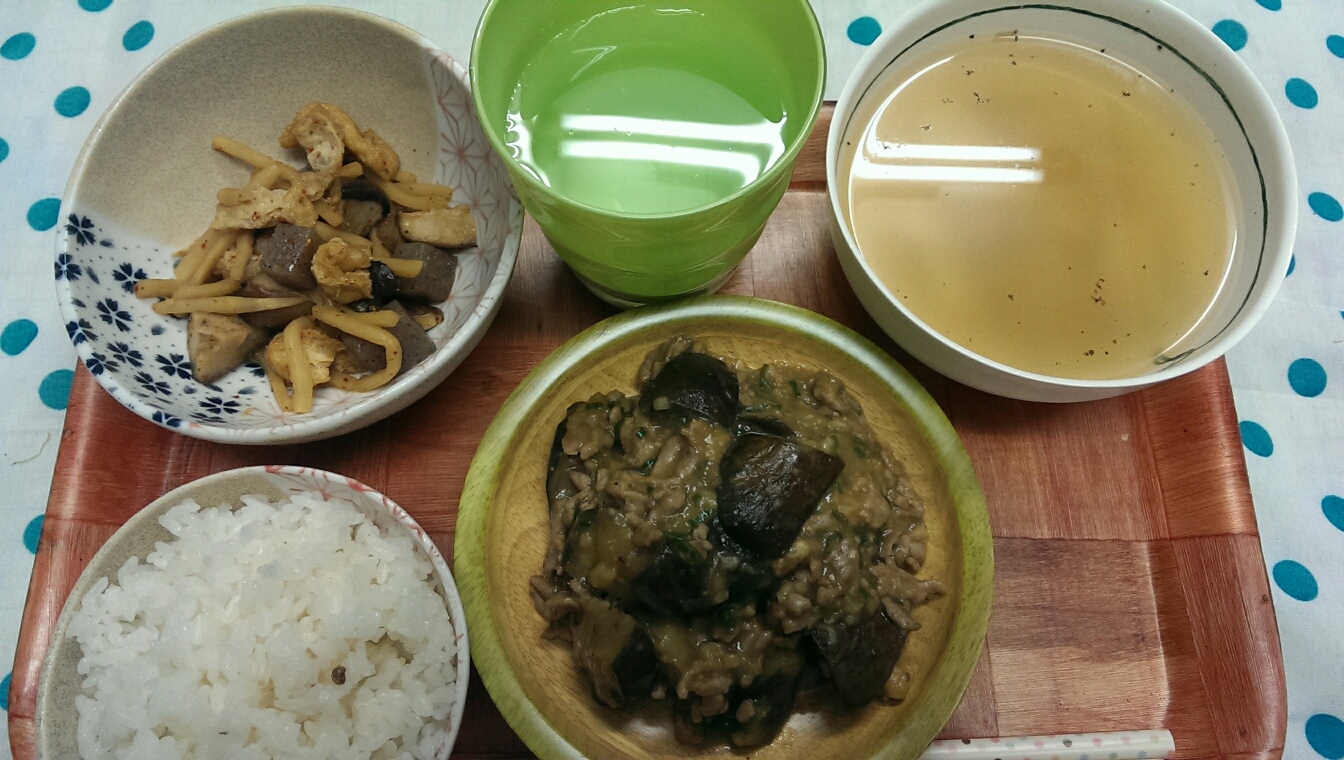 09 September 自炊メモ9月9日(朝、昼、夜) ※撮り忘れ■食パン、きなこ、はちみつ■ヨーグルト、黒ゴマ、はちみつ■カフェオレ■ごはん■おかず・ウインナー・キャベツ・チーズ入り卵焼き■メイン・麻婆茄子■副菜・筍、蒟蒻、椎茸、油揚げの煮物・ジャガイモの鶏ガラスープ