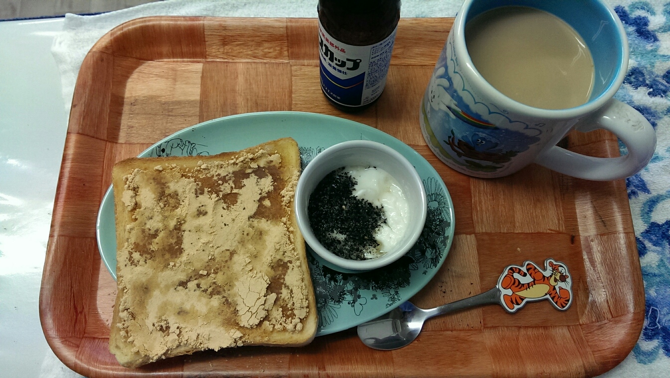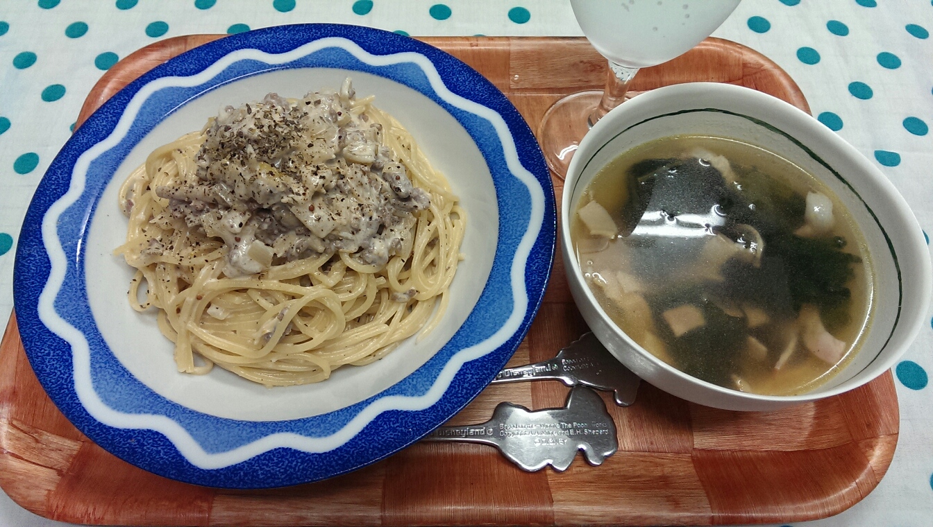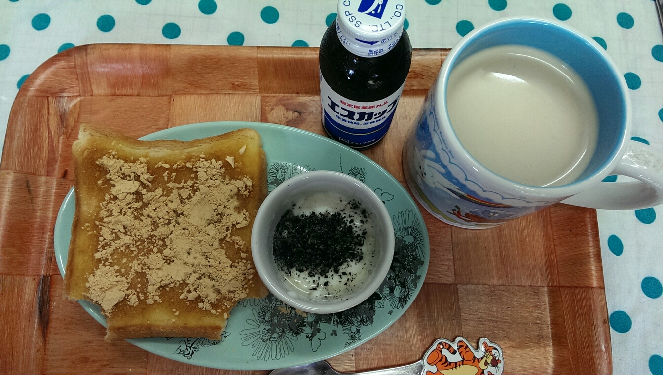 01 September 自炊メモ9月1日(朝、昼、夜) ■食パン、きなこ、はちみつ■ヨーグルト、黒ゴマ、はちみつ■水■栄養ドリンク■ごはん■おかず・大根と牛蒡と鶏肉のさっぱり煮・たまご焼き■メイン・挽き肉と玉ねぎときのこのパスタ(ソースはヨーグルト&マヨ&マスタード)■副菜・ほうれん草とベーコンのコンソメスープ