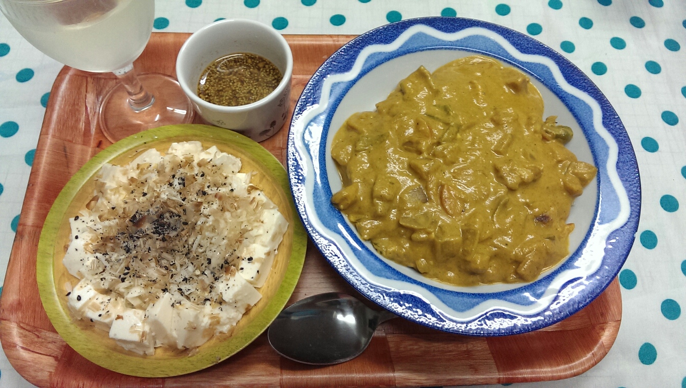 22 August 自炊メモ8月22日(朝、昼、夜) ■食パン、マヨネーズ、ハム■ヨーグルト■コーヒー牛乳■ごはん■おかず・豚肉のしょうが焼き・キャベツの千切り・ほうれんそうとジャガイモの塩コショウ焼き■メイン・ミックスシーフードと野菜のココナッツミルクカレー■副菜・キャベツとお豆腐のサラダ