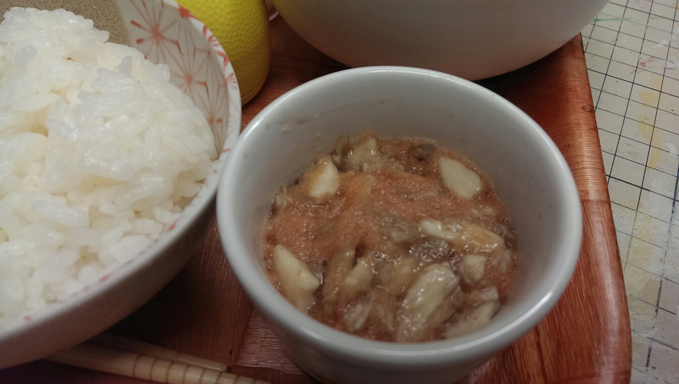 25 August 自炊メモ8月25日(朝、昼、夜) ■食パン、きなこ、はちみつ■ヨーグルト、黒ゴマ■コーヒー牛乳■ごはん■おかず・鶏手羽のさっぱり煮・たまご・きのことウインナーのマスタードソテー■ごはん■メイン・ナスの肉巻き■副菜・山芋の明太子あえ・大根とワカメの味噌汁
