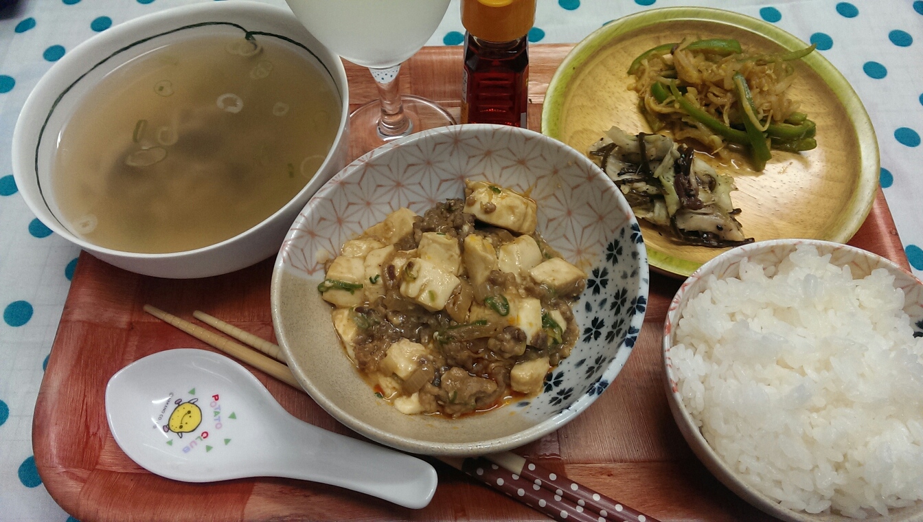 19 August 自炊メモ8月19日(朝、昼、夜) ■食パン、マヨネーズ、ハム■ヨーグルト、グレープフルーツジャム■コーヒー牛乳■食パン、マヨネーズ、ハム■おかず・ピーマンと人参のきんぴら・スクランブルエッグ・肉じゃが(冷凍してあったやつ)■ごはん■メイン・麻婆豆腐・きのことネギの生姜たっぷり鶏ガラスープ■副菜・ピーマンともやしのカレーナムル・キャベツの梅肉あえ