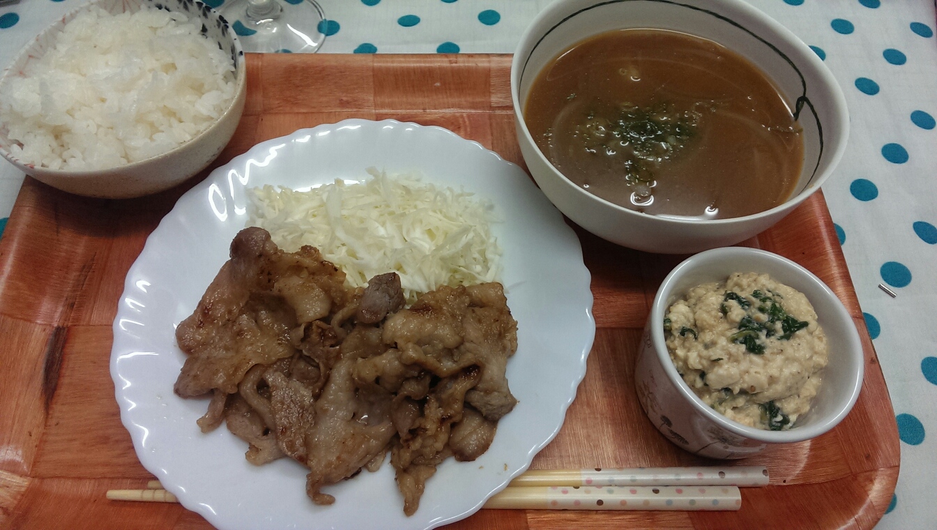 21 August 自炊メモ8月21日(朝、昼、夜) ■食パン、マヨネーズ、ハム■ヨーグルト、グレープフルーツジャム■コーヒー牛乳■炊き込み御飯■キャベツと昆布の梅肉あえ■ごはん■メイン・豚肉の生姜焼き、キャベツの千切り■副菜・豆腐とほうれん草の白和え・玉ねぎとジャガイモのお味噌汁