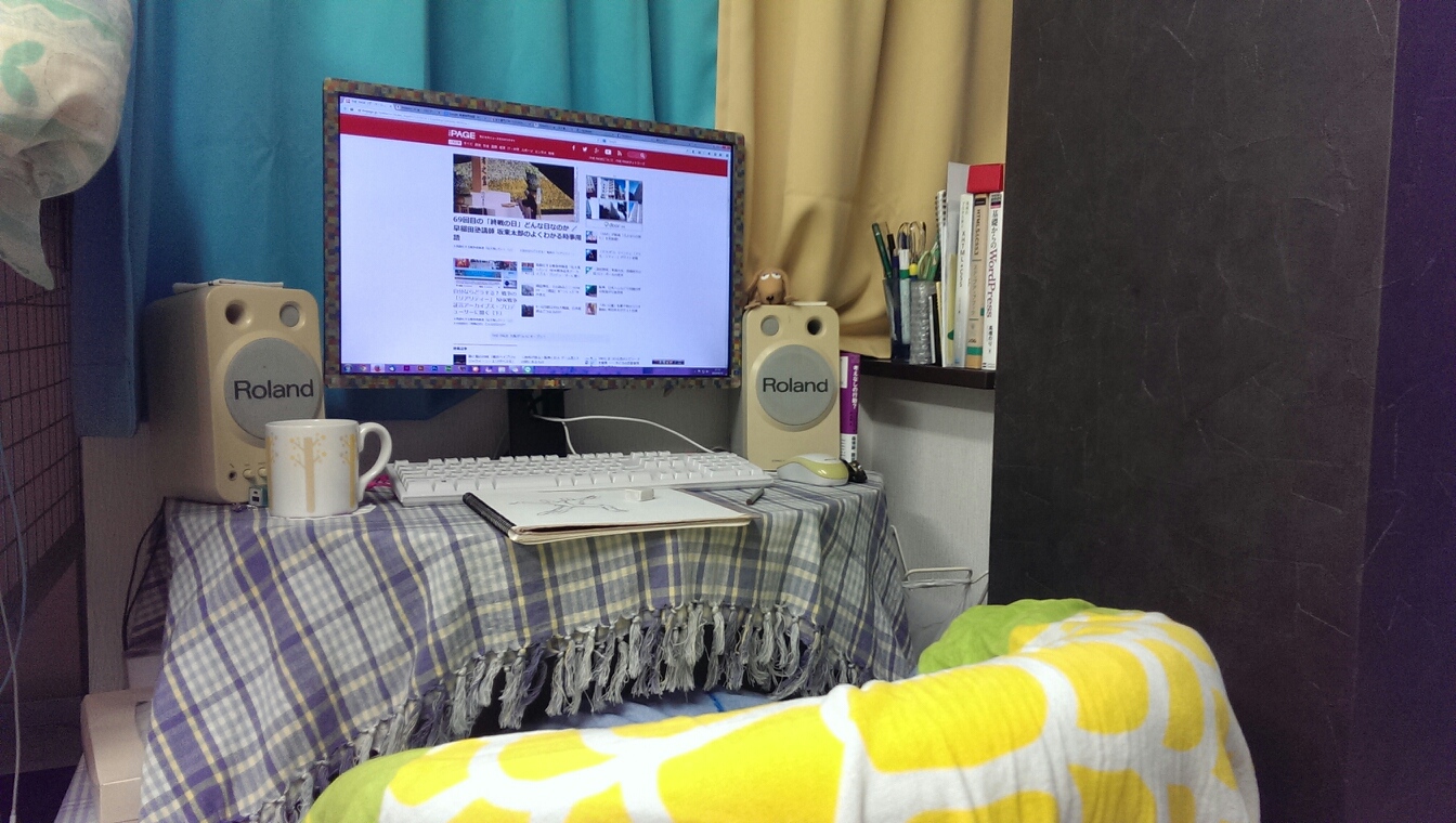 16 August パソコンスペース これといって工夫はない。実家に居るときもこんな感じでした。なれた感じが操作しやすいし、作業もしやすいのです。横を向けばテレビを見ることも出来ます。ソファを壁に寄せれば柱にもたれてリラックスも出来ます。柱と窓の間になぜか窪みがあったので、技術書を置くスペースにしました。便利。便利。反対側はハイベッドになります。ハイベッドの網のところに、ケーブル類を引っ掛けてあります。ハイベッドの下にキャスター付の台を置いて、プリンターを収納してます。(もろもろ写真は後ほど追加!!)