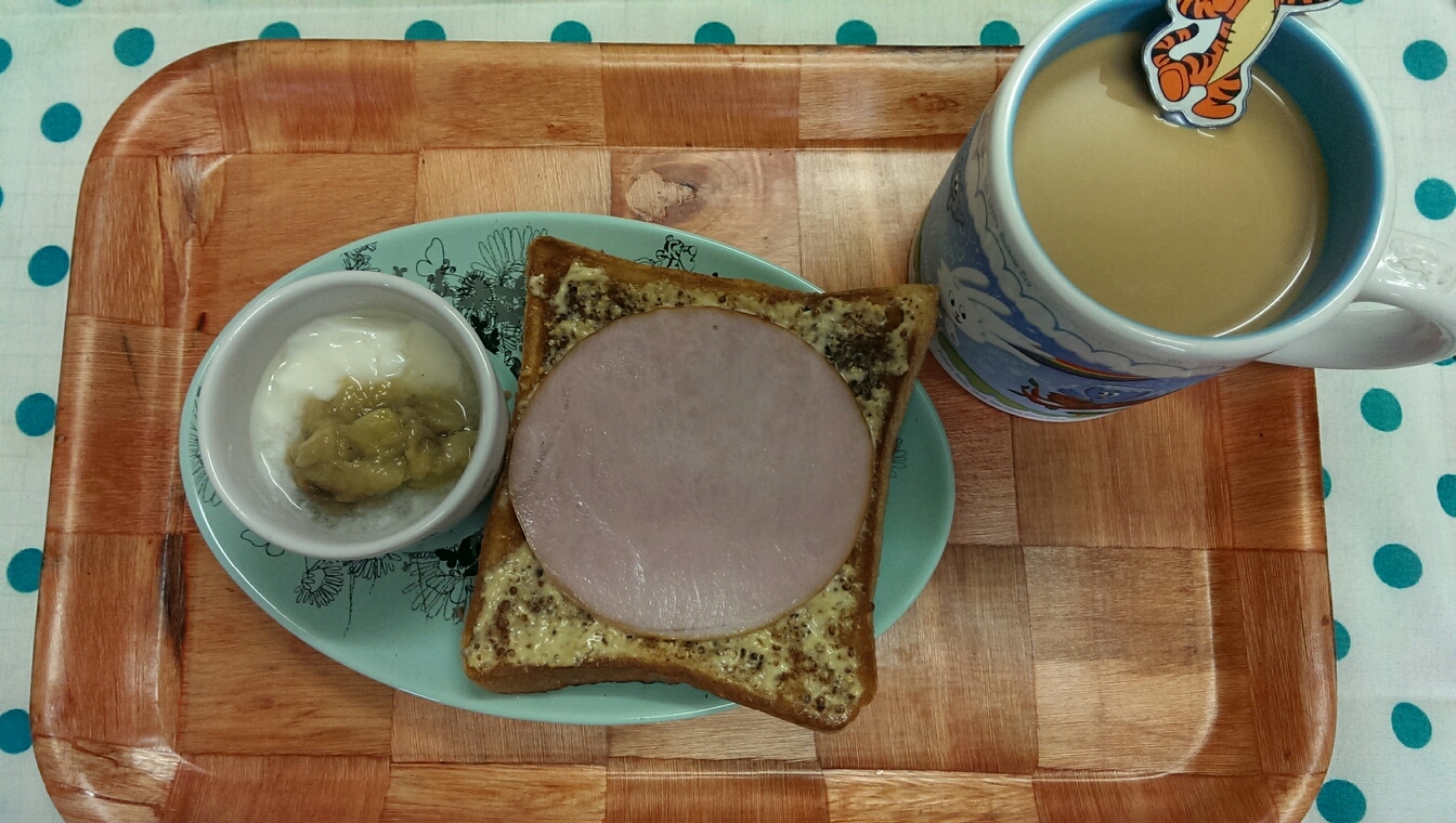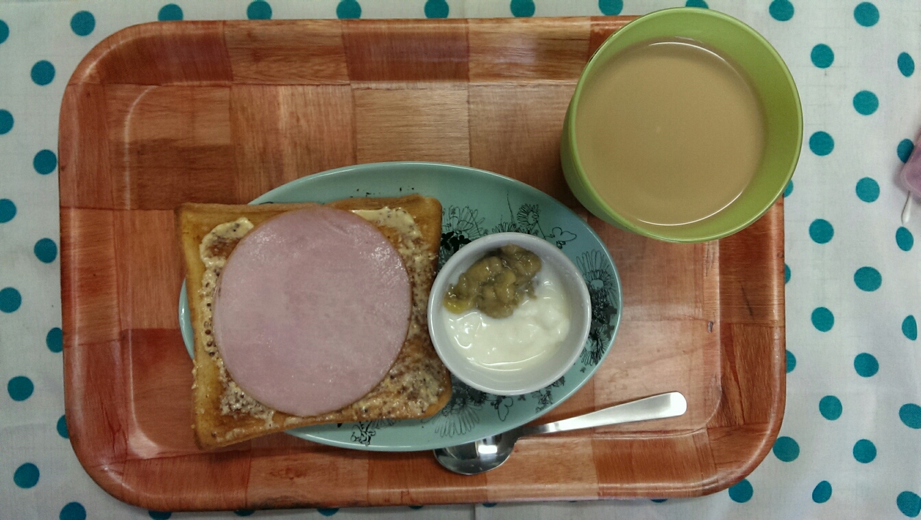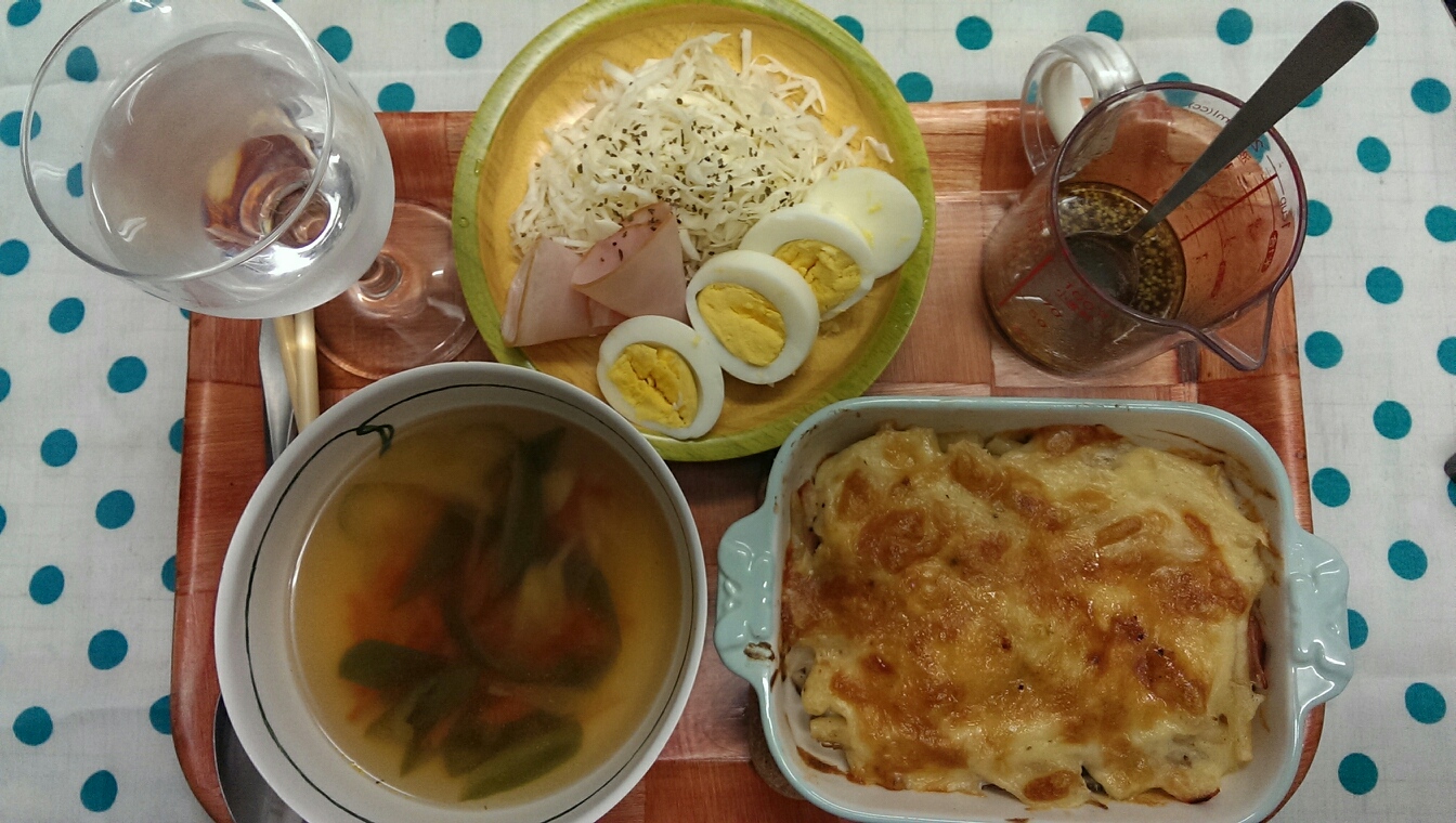 09 August 自炊メモ8月9日(朝、夜) ■食パン、マヨネーズ、ハム■ヨーグルト、バナナジャム■カフェオレ■ご飯■メイン・きのことハムのマカロニグラタン■副菜・サラダ(キャベツ、ハム、ゆで卵、ドレッシング…ポン酢・オリーブオイル・粒マスタード)・ピーマンとにんじんのコンソメスープ