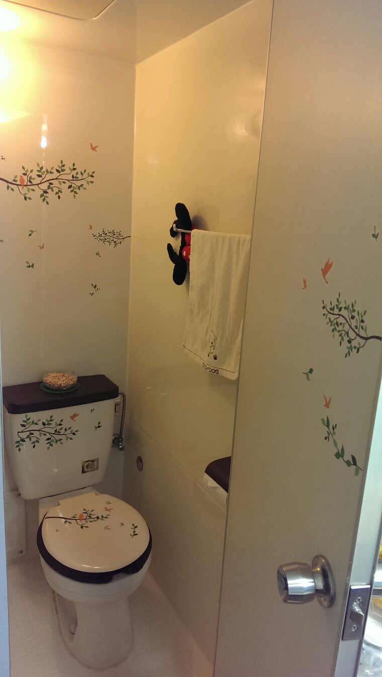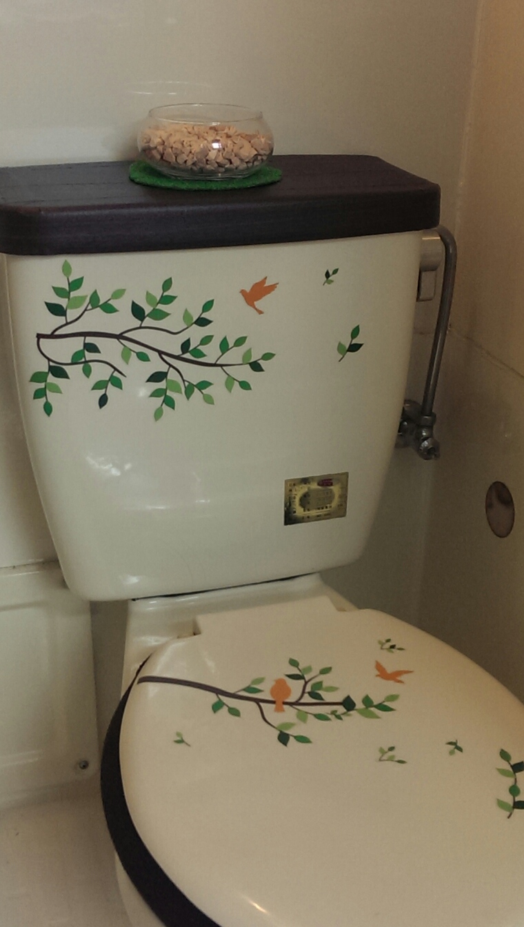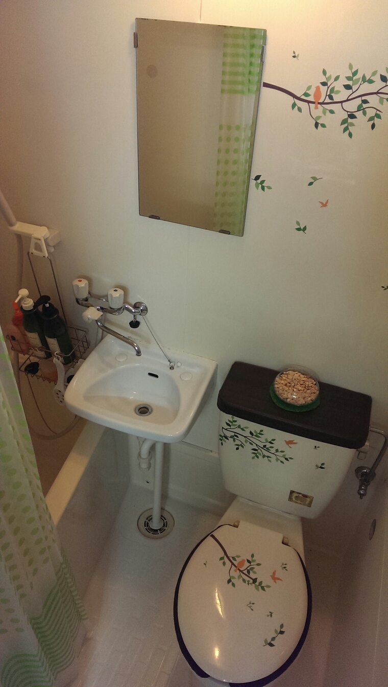 08 August バストイレ 一人暮らしが始まったわけなので、少しずつではありますが、自分の心地よい空間を作って参りましょう。まずは、世間で大不評3点ユニットバス(バス、トイレ、洗面が1つになっている。)を少しでも快適に〜。と、その前に、まず、「ぎゃーーーー!」なハナシ。【NG風水】ユニットバスの部屋は恋愛運がどんどん下がっていく!http://uport.cocoloni.jp/content/1492ぎゃーーーーーー!!!お花を飾らなきゃ〜!!!!賃貸前後に知っておきたい3点ユニットバスに関する情報アレコレhttp://matome.naver.jp/odai/21365032132960972013点ユニットバスを快適に使う工夫http://matome.naver.jp/odai/2136430127593616801こういうのを参考にしたりしてね。快適に過ごせるようにしましょう。テーマカラーというか、室内のテーマは「さわやかな森」にしてみました。グリーンを中心にブラウンとイエローでまとめる感じで。■シャワーラックとにかく床にモノを置かない!って言われたのと、バスタブに掛けるタイプよりスペースが有効に使えそうなのでこちらにしました。レック シャワーラック 2段 BB-213 お風呂【HLS_DU】価格:1,412円(税込、送料別)■珪藻土調湿、消臭に優れていると言われている珪藻土をトイレに。ガラスの器に入れて、タンクの上に置いてあります。■便座カバー100円ショップダイソーで購入。黄色と迷ってブラウンにしました。気分で変えてもいいかもね。■シャワーカーテン100円ショップダイソーで購入。■ウォールステッカー極力、布の物を置くのを避けようと思って、便座カバーとタオルくらいしか置かないつもりだったので、本体、フタ、壁を木と鳥のウォールステッカーや木目調のインテリアシートを貼りました。100円ショップセリアとダイソーにて購入。バストイレ全体。ウォールステッカーは扉の内側にも貼ってある。浴槽は狭いし、そちら側はゴチャゴチャしないようにしてる。便器部分のアップ茶色い木目調のステッカーが上手く貼れなかった。要練習で再チャレンジしたいところ。■イスただの厚めの板です。浴槽の幅にあっているやつ。脚のマッサージをするときとか、シャワーを浴びてボーッとしたいときとかに使っております。結構便利。壁面はどうしようかなぁ〜。暗いのが嫌なので、電球を変えるか、もうひとつ電池式のライトでも付けようかと企んでいる。あと、鏡にも茶色いフレームを付けようかと思ってる。歯ブラシは万が一カビたら嫌だなと思って、ココには置いておりません。出たところに置いてある。掃除道具が無いのは買っていないからよ!